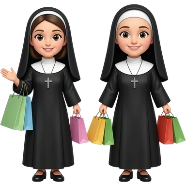 Nun young woman, in nun outfit, very extra long black hair showing under veil, small gold cross necklace, big brown eyes, big lips, adult curvy woman but fully covered body except for head and hair, lip gloss on. Dark eyebrows, long eyelashes. emoji