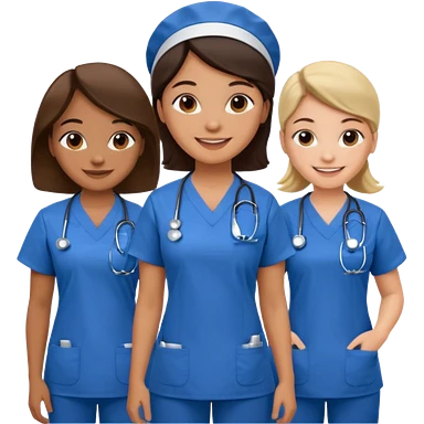 3 nurses: nurse 1 is wearing green work clothes, curly hair, middle european. nurse 2 is wearing blue work clothes, blond hair, scandinavic, nurse 3 is wearing white work clothes, red hair. they all stand in a classroom, "Academy" written in white on board emoji