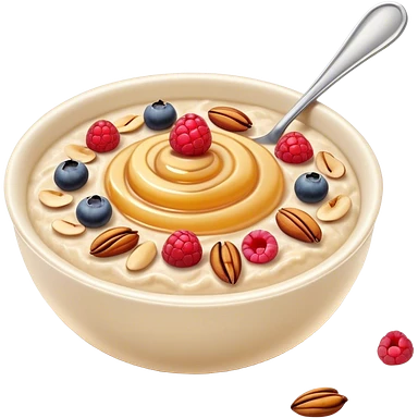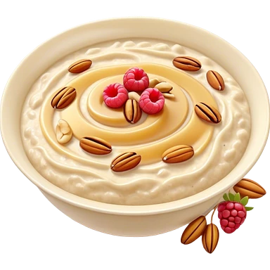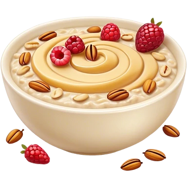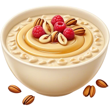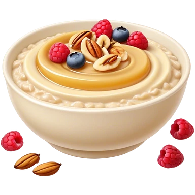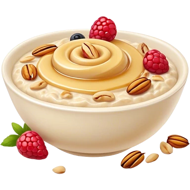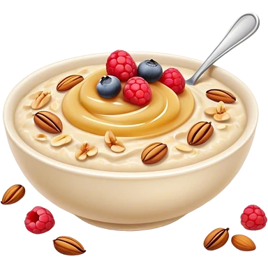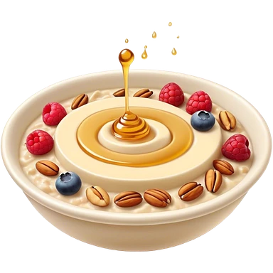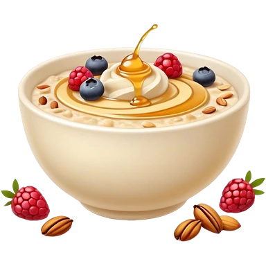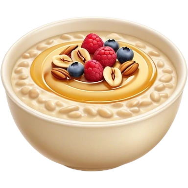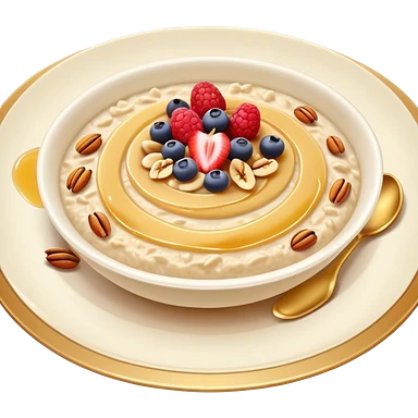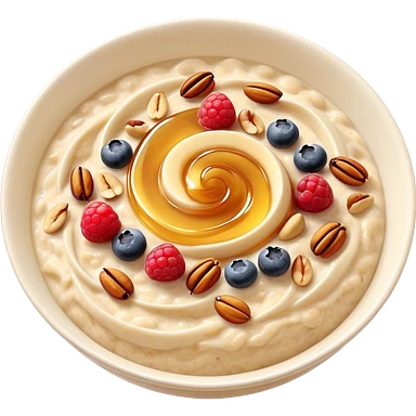 Cinematic creamy oatmeal, smooth texture with a swirl of honey on top, garnished with fresh berries and nuts, warm and comforting, cozy golden tones, rich and delicious. emoji
