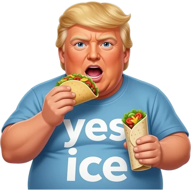 very fat obese donald trump with a pot belly eats mexican food and on his shirt says "yes ice" emoji