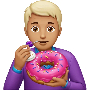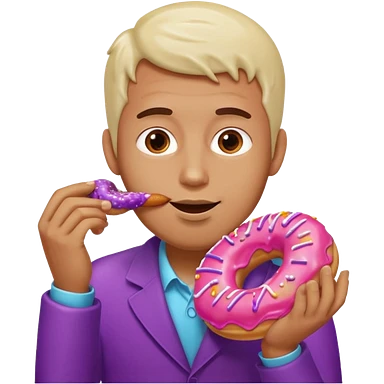 A man eating a pink donut and an eggplant covered in white sauce emoji