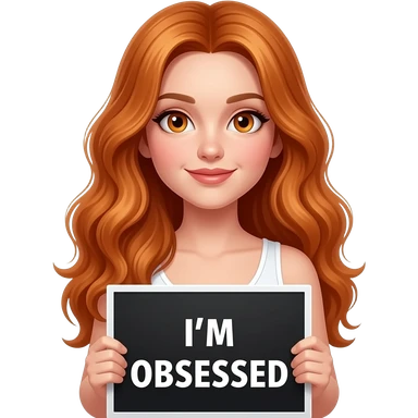 sexy girl with long wavy ginger hair and ginger eyes wearing a white tanktop is holding a black colored sign with I'M OBSESSED written on it emoji