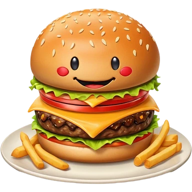 Burger on a plate with fries. The burger is smiling and drooling- looks euphoric and delicious. emoji