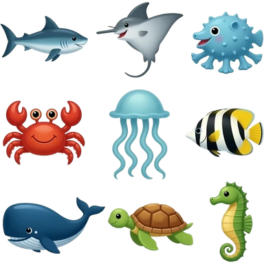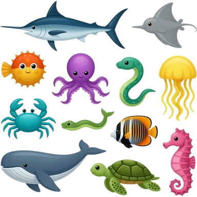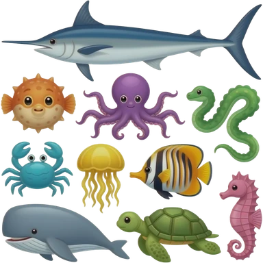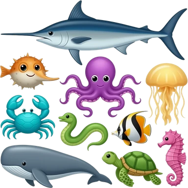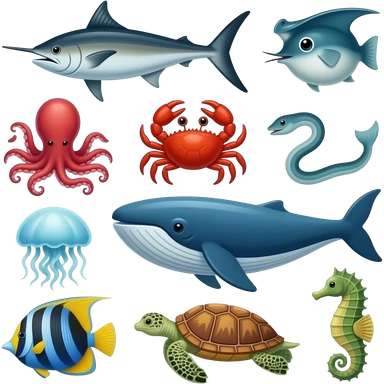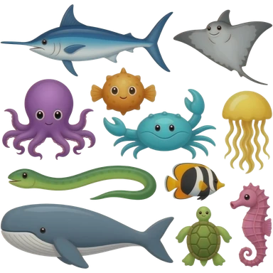 ocean animals inside the barn (farm): Blue swordfish, gray stingray, orange and yellow blowfish, purple octopus, turquoise crab, green eel, yellow jellyfish, orange and black angelfish, gray whale, green sea turtle, and pink seahorse emoji | AI Emoji Generator