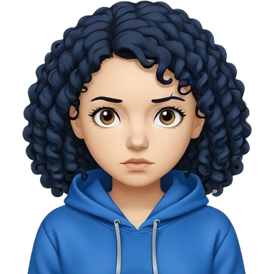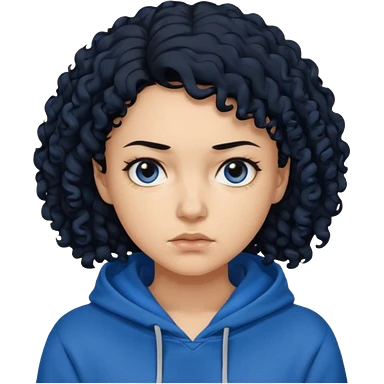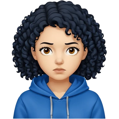A woman with curly black hair, wearing a blue-black hoodie, and a slightly serious expression on her face. emoji