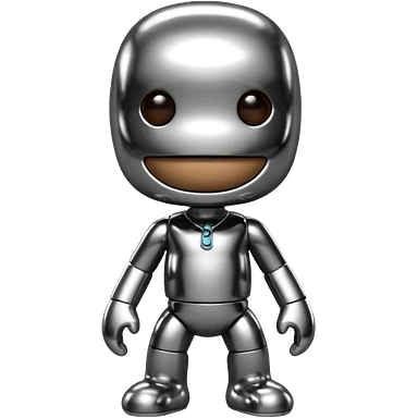 Turn this Sackboy character in the photo into 3D chrome metallic style, highly reflective and shiny, with realistic details emoji