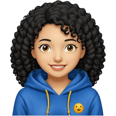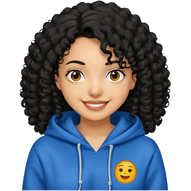 A women with a black curly hair who wear a hoodie and that hoodie have a some smorf emoji
