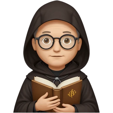 Monk priest prayer black habit with hood round black glasses done light brown wavy hair under hood remove the medallion smaller more round glassed age 46 no necklace more oval face hand holding book that says RB 480 emoji