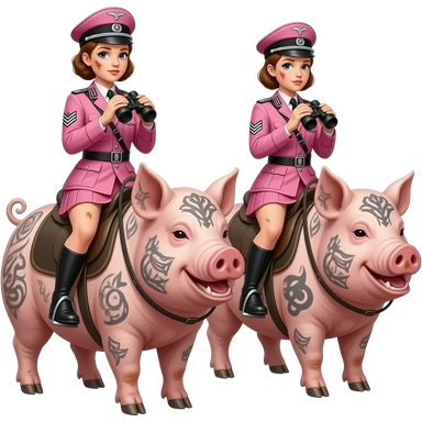 aesthetic brilliant divine lighting, oil paint - Two skinny and dirty female riders in pink World War II German army uniforms ride jumps on large tattooed pigs with binoculars in their hands emoji