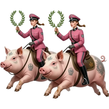 aesthetic brilliant divine lighting, oil paint - two skinny and dirty female riders in pink German army uniforms from World War II ride jumping on large tattooed pigs with laurel branches in their hands emoji