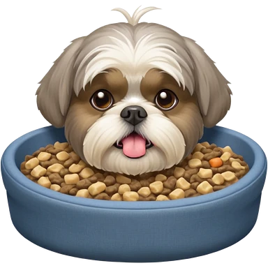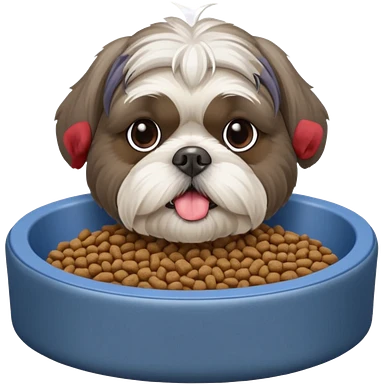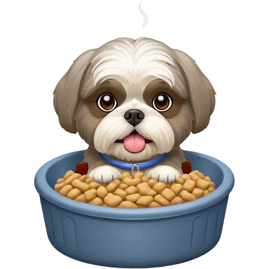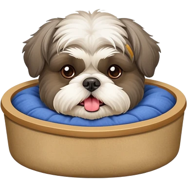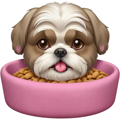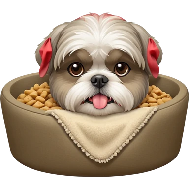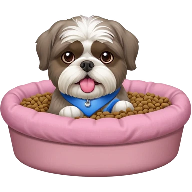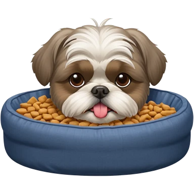 old ALL grey shih tzu in pink dog bed tongue hanging out near bowl of food emoji | AI Emoji Generator