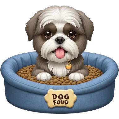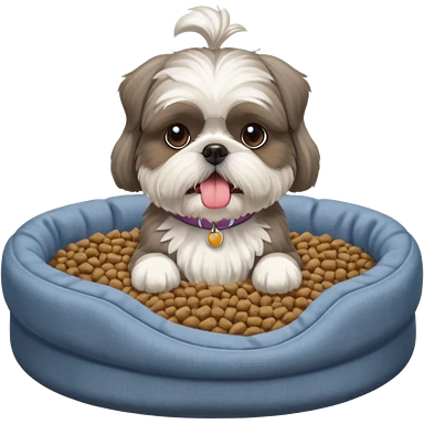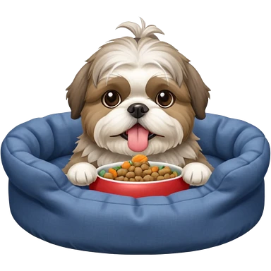 old ALL grey shih tzu in dog bed tongue hanging out bowl of food in front emoji