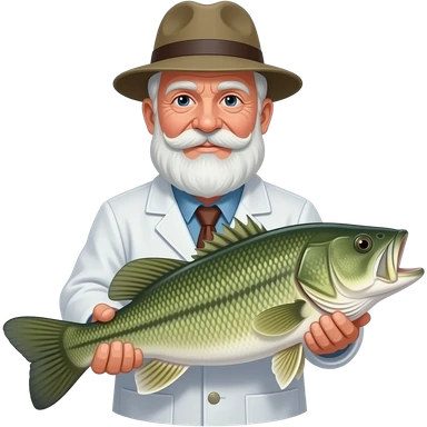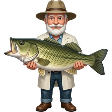 old fisherman with a white coat on and baseball hat holding a huge bass emoji | AI Emoji Generator