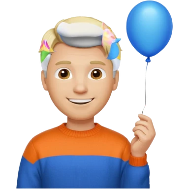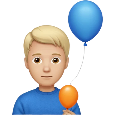 white skin, blonde hair man, orange sweater, hold blue balloon emoji