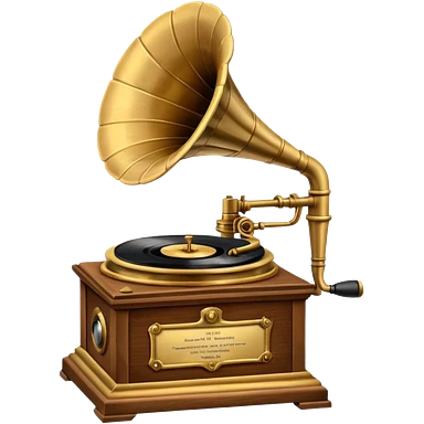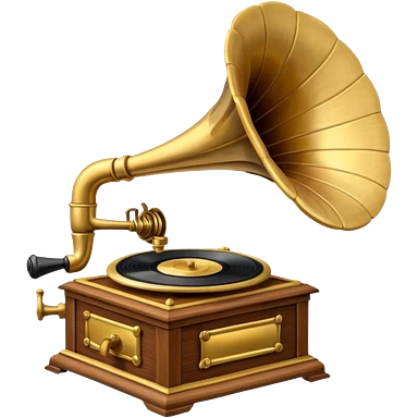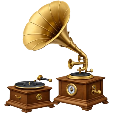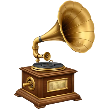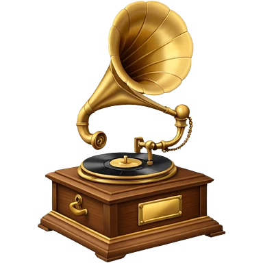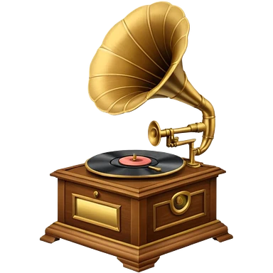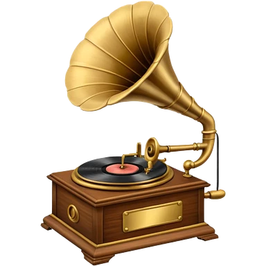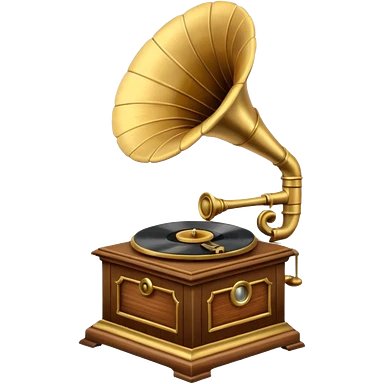 3D render of Gramophone, vintage 1980s audio equipment aesthetic, tactile analog buttons, polished brass gold horn with a dark mahogany wood base, mixed wood grain and brushed aluminum textures, Apple emoji style, isolated on white background --v 6.0 emoji