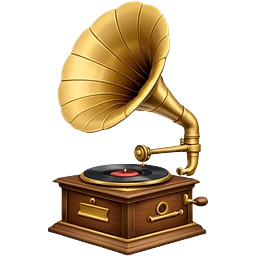 3D render of Gramophone, vintage 1980s audio equipment aesthetic, tactile analog buttons, polished brass gold horn with a dark mahogany wood base, mixed wood grain and brushed aluminum textures, Apple emoji style, isolated on white background --v 6.0 emoji