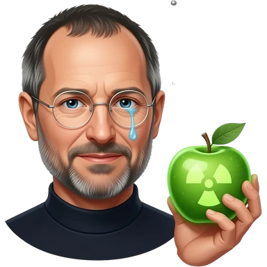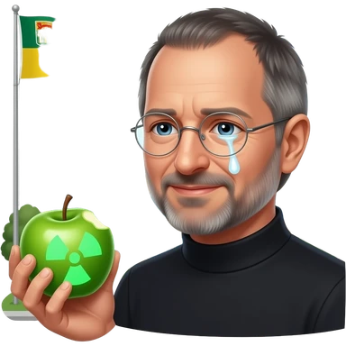 apple cofounder steve jobs holding a half eaten glowing neon green radioactive apple while crying single oil droplet tears and milk rains from the sky and a single saskatchewan flag is flying emoji