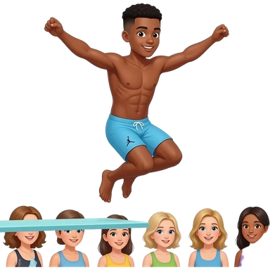 make a black skinned 20 year old man in a brown low taper fade with no shirt bunch of abs jumping off the high diving board in light blue jordan swimtrunks and a bunch of girls are watching him from below emoji