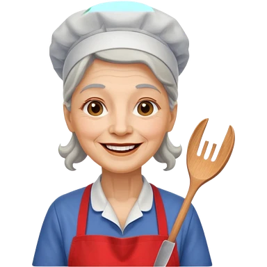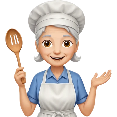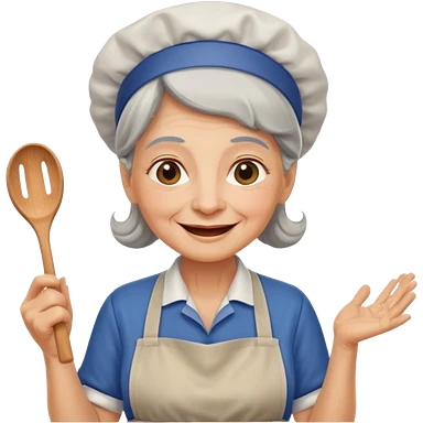 cheerful rural old woman in Apple iOS emoji style, chubby cheeks, short gray curly hair, flowery blouse, colorful apron, pastel tones, expressive eyes, Chilean rural kitchen with clay pots, warm inviting lighting, clean vector look emoji