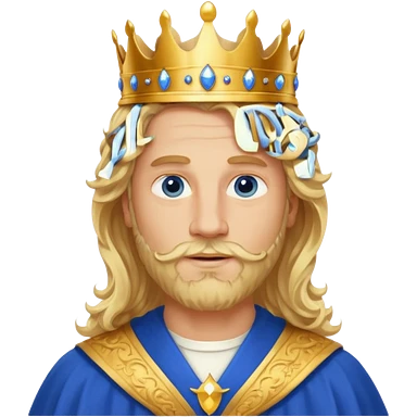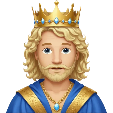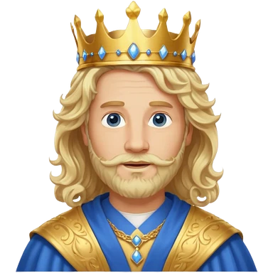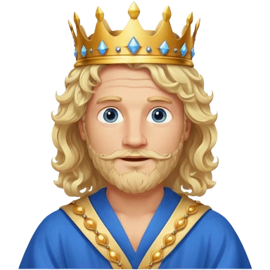 1 Middle-aged white king, 40 years old, blond hair, blond beard, long curly hair, blue eyes, kind and benevolent vibe, gentle smile, wearing a crown and blue robe emoji emoji