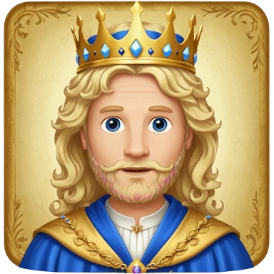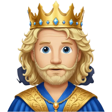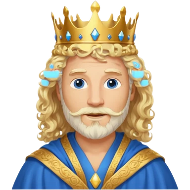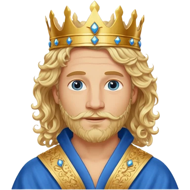 1 Middle-aged white king, 40 years old, blond hair, blond beard, long curly hair, blue eyes, kind and benevolent vibe, gentle smile, wearing a crown and blue robe emoj emoji