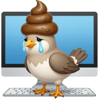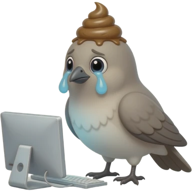Create a shit bird emoji. It should have the body of a bird and a pile of poop as head. It should be sad and crying. The background should have a personal computer. The. Ire’s head should be replaced as a pile of poop emoji