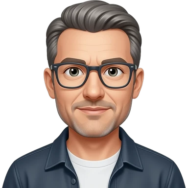 very entellectual man, 59 years old, street wear stubble, shaved, No beard, but a little stubble, glasses short with clippers, but not bald emoji