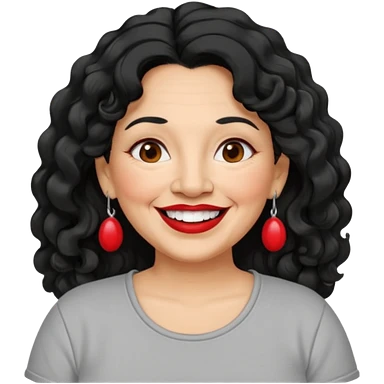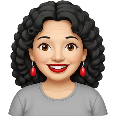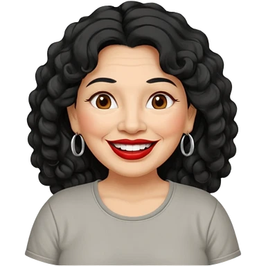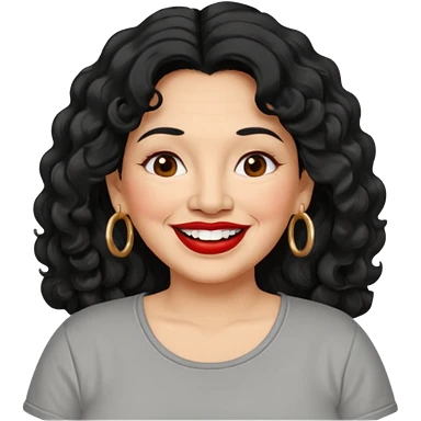 60 yr old Mexican woman, slightly chubby, wavy/curly long black hair, red lipstick, big smile, white teeth, brown eyes, hoop earings, side part to hair, round face, grey t shirt, hair side swept, big hoop earing emoji