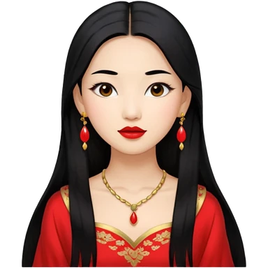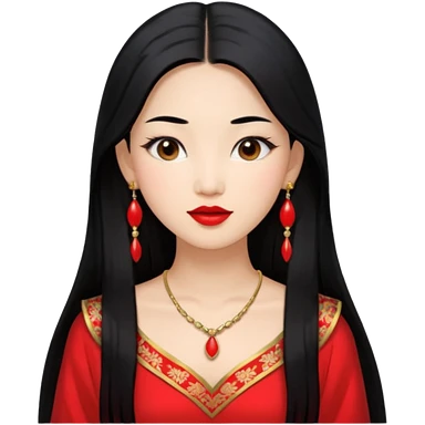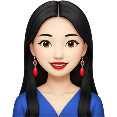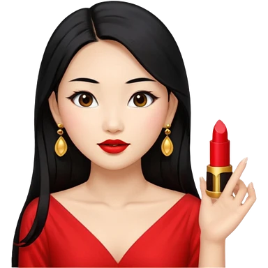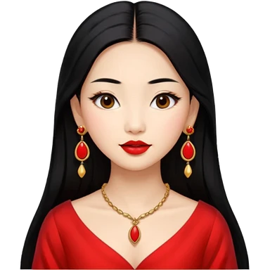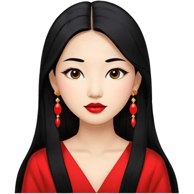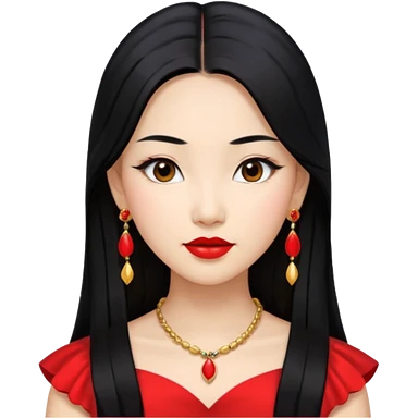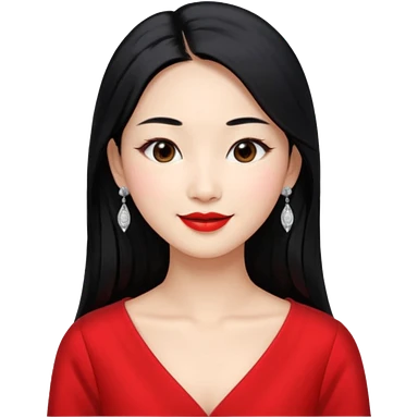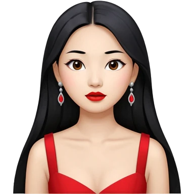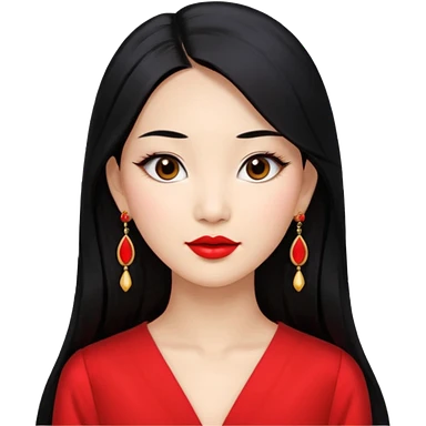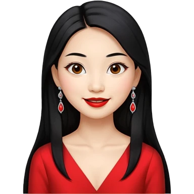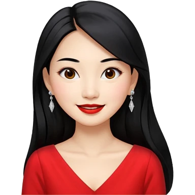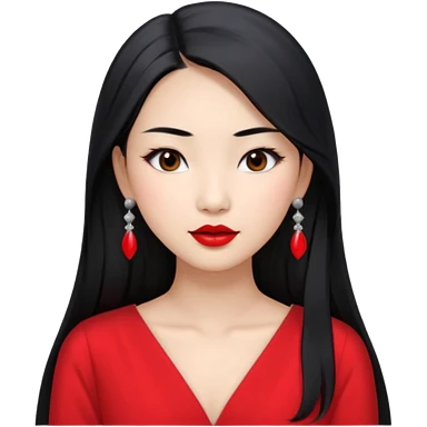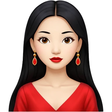 30 yr old asian woman, middle parted straight long black hair, very pretty, fancy dress, earings, red lipstick emoji