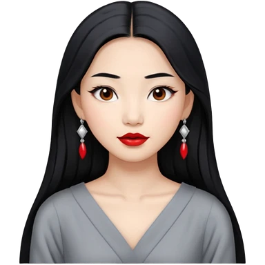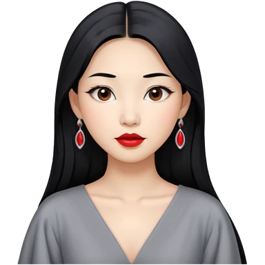 30 yr old asian woman, middle parted straight long black hair, very pretty, fancy grey dress, earings, red lipstick, silver earings emoji