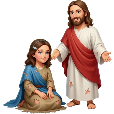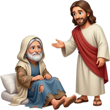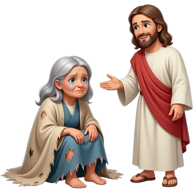 A full bodied old sick and sad woman Who is poor sitting on the ground unable to walk and dress in tattered biblical clothing and Jesus stops to talk to him With a smile on his face emoji