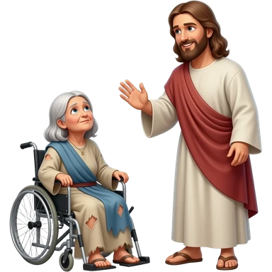 A full bodied old paralyzed woman Who is poor sitting on the ground unable to walk and dress in tattered biblical clothing and Jesus stops to talk to him With a smile on his face emoji