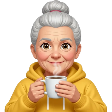 change her dress into yellow hoodie and also change the cup color old women with bun and drink coffee with smoke create this with front view emoji