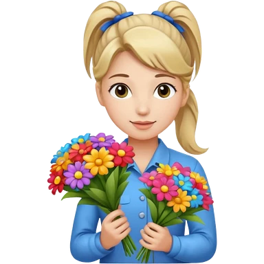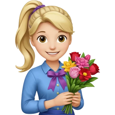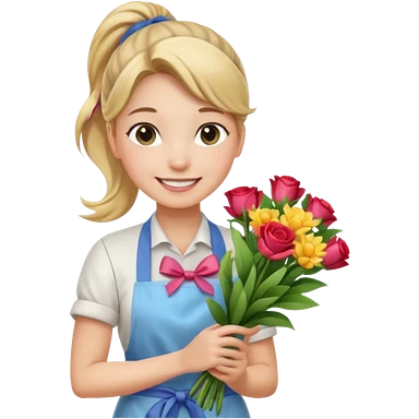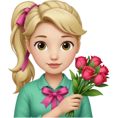 Young female florist – ponytail, holding a bouquet with ribbon emoji