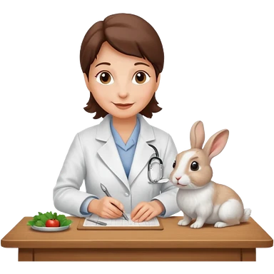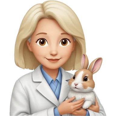 Older female vet – gentle smile, coat, checking rabbit emoji