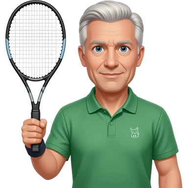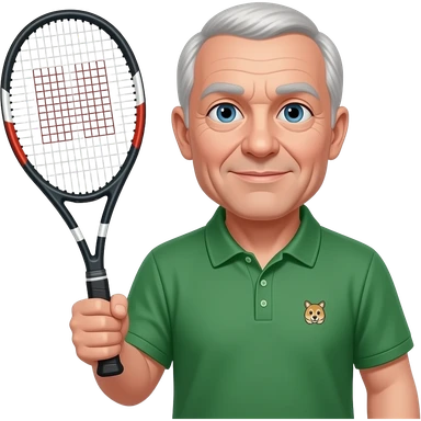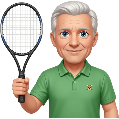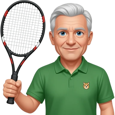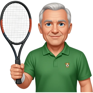 older man, no dupples in face, tennis racket in right hand, green bottle polo with small animal logo, blue eyes, lite hair all over emoji