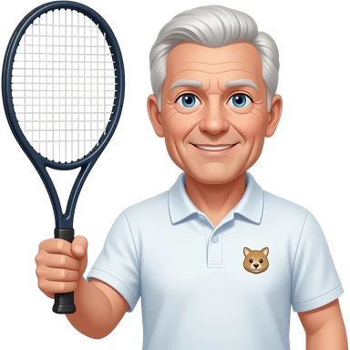 older man, tennis racket in right hand, bottle polo with small animal logo, blue eyes, lite hair all over emoji