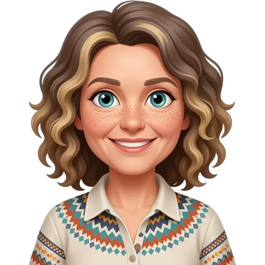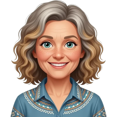 older woman boho shirt shoulder length curly more greyish brown blond highlights blue/green eyes freckles across nose smiling woman emoji