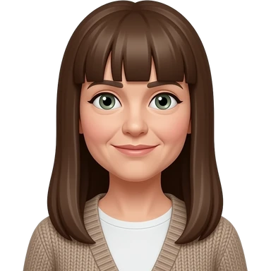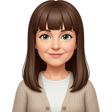 older woman with long straight brown hair and bangs, grey-green eyes, wearing a cardigan emoji