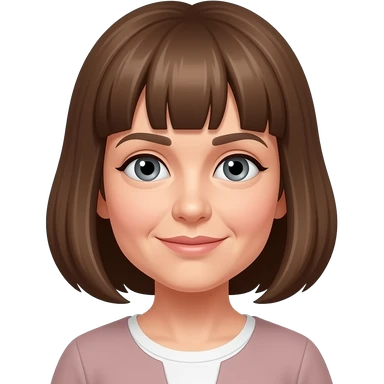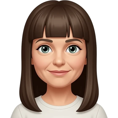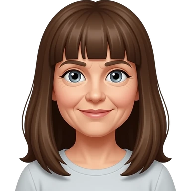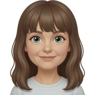 older woman with long brown hair and bangs, grey-green eyes emoji