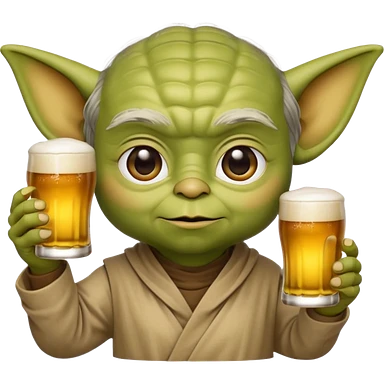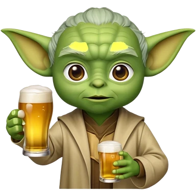 3D emoji-style Yoda head holding a beer glass in one hand. Smooth rounded shapes, soft gradients, friendly expression. Golden beer with foam in transparent glass. Close-up, centered. PNG, transparent background. emoji