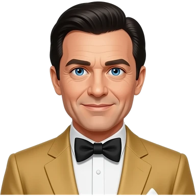 Oliver Reed with blue eyes, black 60s hair, golden tan oscars suit with bow tie emoji | AI Emoji Generator