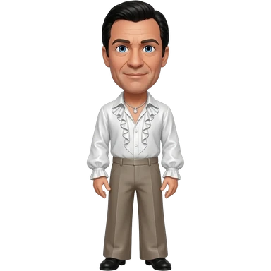 Oliver Reed with blue eyes, black hair, white metallic ruffle shirt, taupe metallic wide leg pants, silver necklace emoji