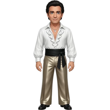 Oliver Reed with blue eyes, black hair, white metallic ruffle shirt, black obi belt, taupe metallic wide leg pants, silver necklace emoji