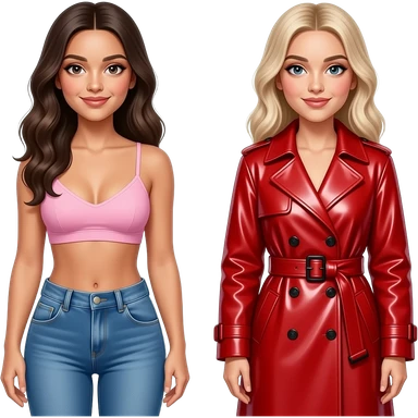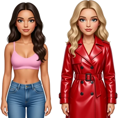 Olivia Rodrigo and Addison Rae. Olivia wears a pale pink bralette paired with low-rise blue denim jeans. Addison Rae wears vibrant red latex or patent leather trench coat, featuring a wide belt and structured cuffs emoji
