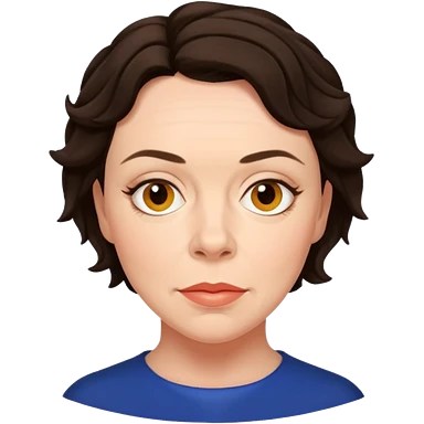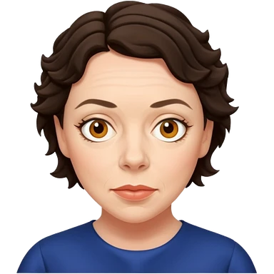 Mujer, cara redonda, cejas definidas, pelo muy largo rizado, peinado hacia atrás con bucles sueltos al frente. Sonrisa amplia, expresión alegre. Blusa verde olivo emoji