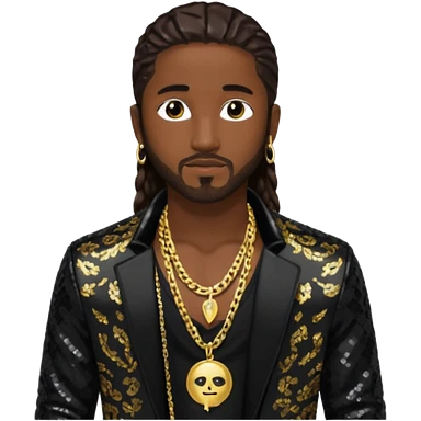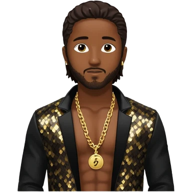 Omarion with long dark brown hair, shirtless with necklace, metallic bronze jacket emoji