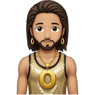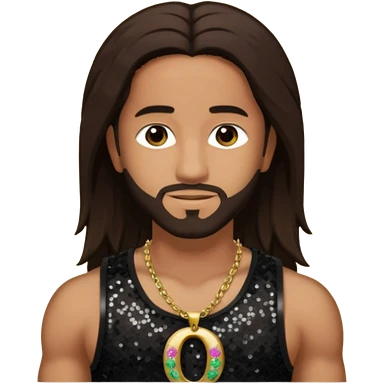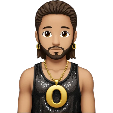 Omarion with long dark brown hair, dark brown sequin tank top, necklace with letter o emoji