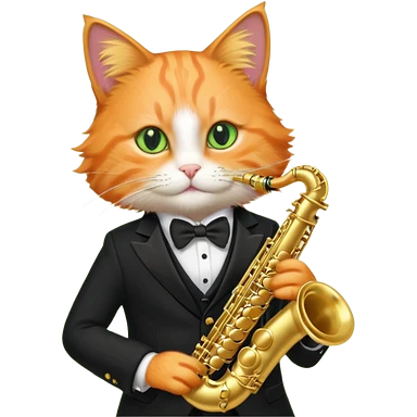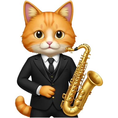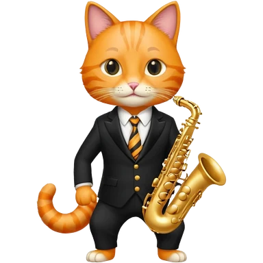 orange cat play gold saxophone, wear black suit emoji
