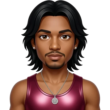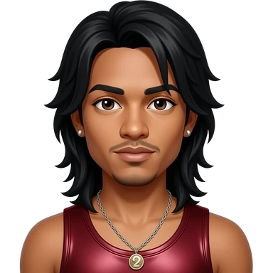 Omarion from B2K with dark brown eyes, long black hair, deep red metallic tank top, necklace and earrings emoji